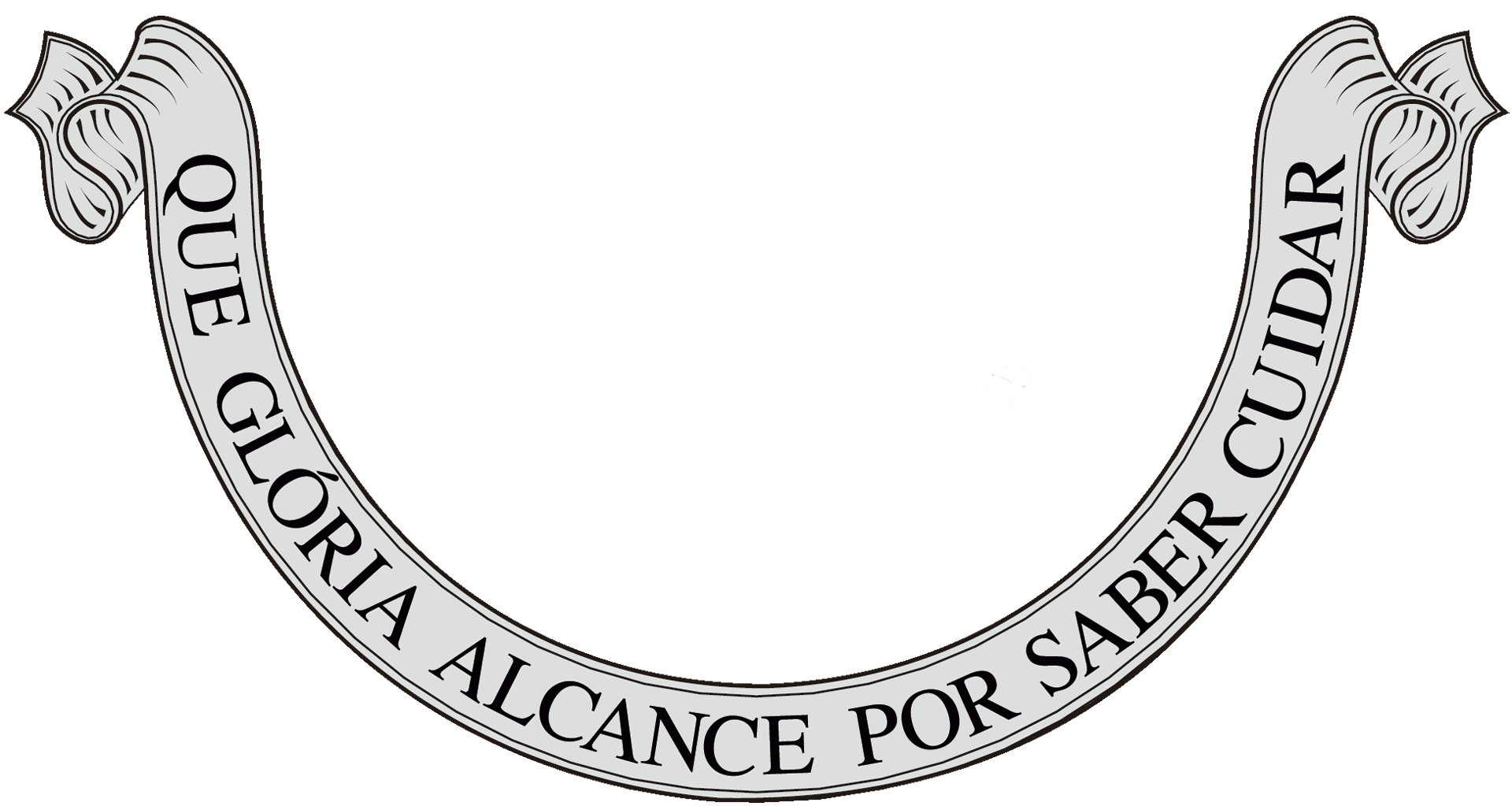 Num listel de prata, ondulado, sotoposto ao escudo, em letras de negro, maiúsculas, de estilo elzevir “QUE GLÓRIA ALCANCE POR SABER CUIDAR”Esmaltes