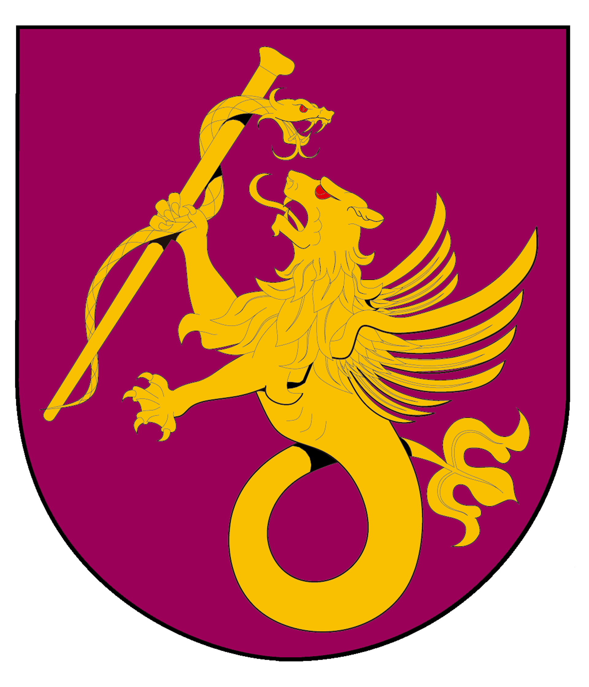 De púrpura, um leão-marinho alado, de ouro, animado de vermelho, segurando na garra dextra o bastão de Esculápio de ouro, sendo a serpente de ouro animada de vermelho