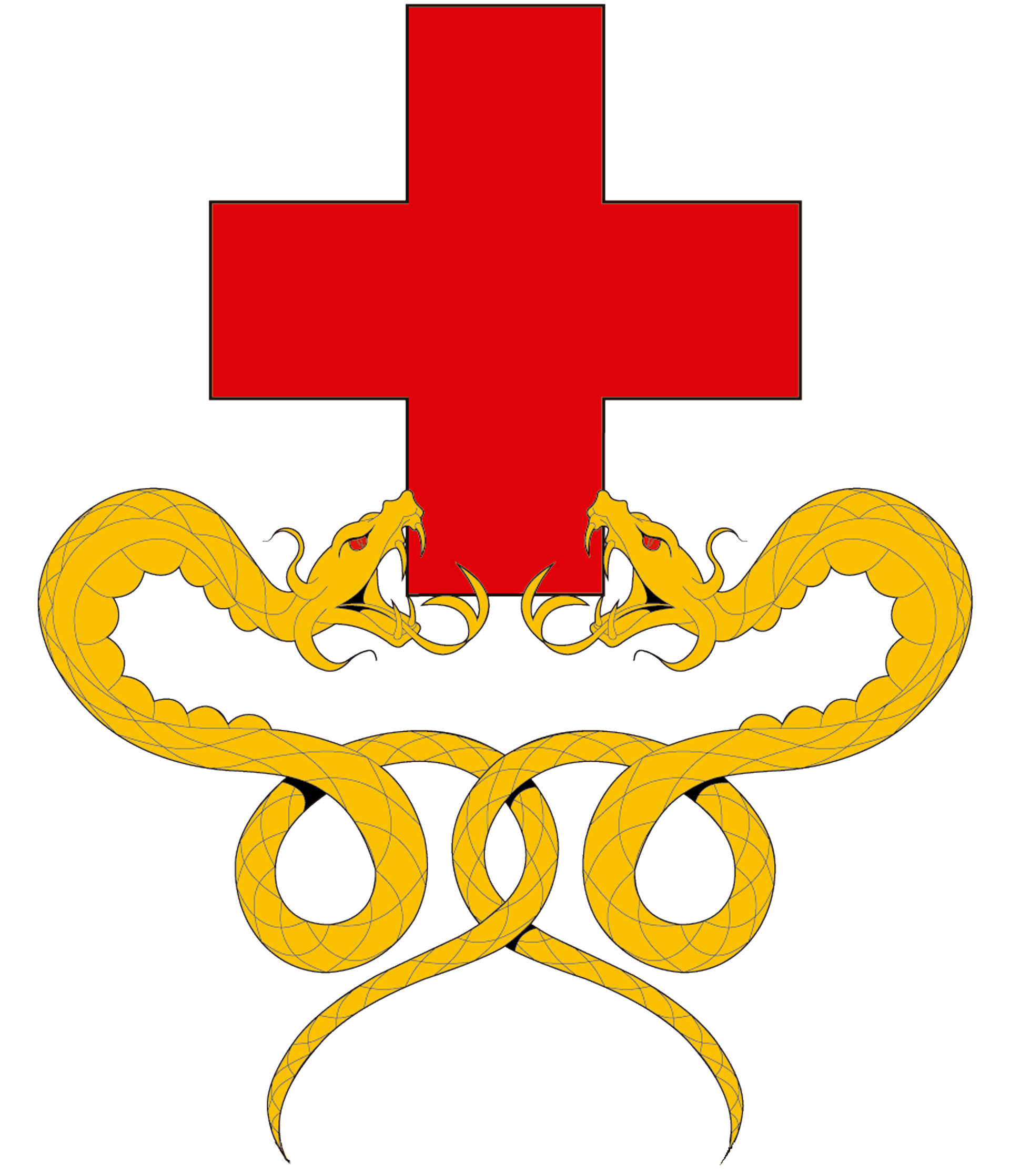 Uma cruz de vermelho sustida por duas serpentes de ouro, afrontadas e animadas de vermelho.